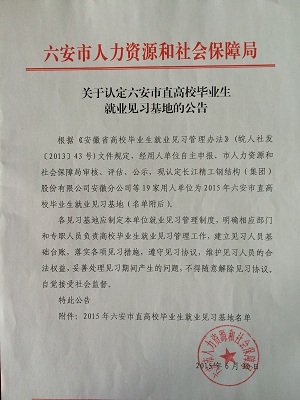 根據(jù)《安徽省高校畢業(yè)生就業(yè)見習管理辦法》(皖人社發(fā)〔2013〕43號)文件規(guī)定,近日,市人社局公布了新認定的2015年市直高校畢業(yè)生就業(yè)見習基地及其提供的160個就業(yè)見習崗位,計劃接收就業(yè)見習人員300名。畢業(yè)兩年內(nèi)的未就業(yè)高校畢業(yè)生,可以挑選適合自己的崗位,報名參加帶薪就業(yè)見習。安徽正陽機械科技有限公司獲此殊榮。