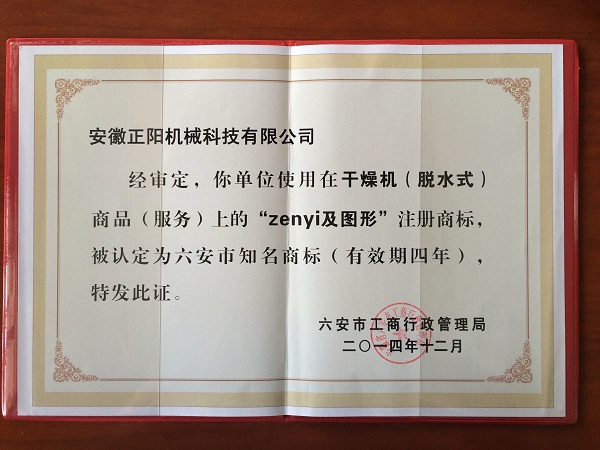 近日,安徽正陽(yáng)機(jī)械科技有限公司“zenyi”牌干燥機(jī)(脫水式)商標(biāo)經(jīng)過(guò)申報(bào)、評(píng)選、公示等程序,正式被六安市工商行政管理局認(rèn)定為“六安市知名商標(biāo)”。這是公司全體員工共同努力的結(jié)果,是六安市工商行政管理局等政府職能部門親切關(guān)懷和大力支持的結(jié)果,標(biāo)志著安徽正陽(yáng)機(jī)械科技有限公司在品牌化戰(zhàn)略發(fā)展道路上又前進(jìn)了一大步。